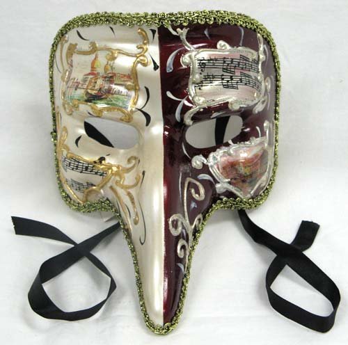 Constructed from hard plastic, this unique zanni style mask would be great for any masquerade ball. The mask is about 7" wide and 8" long. The mask features unique detailed images painted right on it.